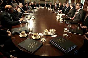 2月5日,在美國首都華盛頓白宮舉行的內(nèi)閣會議上,幾本美國2008財政年度預(yù)算報告被擺在桌子上。當日,美國總統(tǒng)布什向國會提交2008財政年度預(yù)算報告時提出總額為7165億美元的軍費申請。新華社/路透