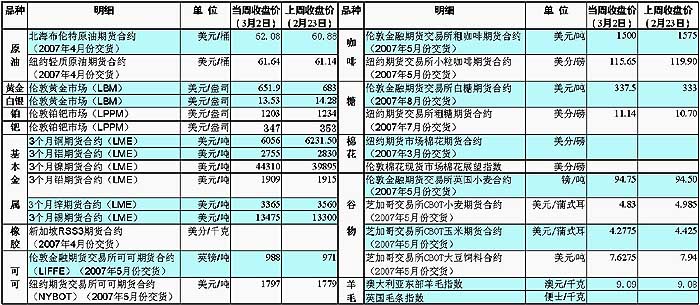 當(dāng)周國際油價連續(xù)多日上漲,但在最后一個交易日小幅回落。影響當(dāng)周國際油價走勢的主要因素包括美國成品油庫存下降、全球股市下跌及美國春季來臨汽油消費量增加等。 從2月24日開始,美國中西部和東北部地區(qū)先后出現(xiàn)暴風(fēng)雪天氣,交易者預(yù)計這將導(dǎo)致取暖油消費量增加。另外,美國能源部2月28日公布的最新石油庫存數(shù)據(jù)顯示,在截至2月23日的一周里,美國的汽油庫存下降了190萬桶,降至2.202億桶,包括取暖油和柴油在內(nèi)的其他成品油庫存也下降了380萬桶,降至1.245億桶。目前,美國成品油庫存低于去年同期水平。再加上美國春季來臨汽油消費量增加以及伊朗核問題等因素影響,國際油價連續(xù)上漲,紐約和倫敦市場油價在3月1日雙雙站上每桶62美元,創(chuàng)下年內(nèi)最高收盤價。 但在最后一個交易日,由于全球一些主要股市繼續(xù)大幅下挫,引發(fā)了投資者對經(jīng)濟(jì)前景的擔(dān)憂,這對油市產(chǎn)生了不利影響,并結(jié)束了之前油市的連續(xù)上漲行情。 美國供應(yīng)管理協(xié)會1日發(fā)表的報告顯示,美國制造業(yè)活動指數(shù)2月份為52.3,高于前一個月的49.3。在此利好消息推動下,美元對歐元匯率有所上揚,從而拉低了黃金的期貨價格。其它貴金屬的價格也各有不同程度的下滑。因市場擔(dān)心全球庫存較低,鉛和鎳的價格上揚,鉛價升至1953年開始在倫敦上市交易以來的最高點——每噸1975.15美元,鎳價也升至每噸42200美元的歷史新高。其它基本金屬的價格則紛紛下挫。 據(jù)可可主產(chǎn)國科特迪瓦的出口商預(yù)計,2006年10月至今年3月的可可產(chǎn)量約達(dá)91.5萬噸,低于上一年度的94.4萬噸,因此可可的價格上漲。由于主產(chǎn)國越南的咖啡產(chǎn)量過剩,咖啡價格走低。此外,美國市場谷物類價格多數(shù)下滑。