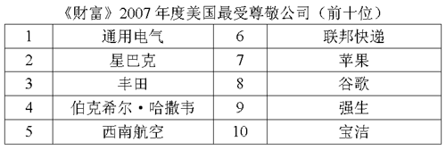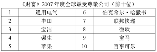 美國《財富》雜志網(wǎng)站日前公布了2007年度全美最受尊敬公司排名榜,通用電氣公司蟬聯(lián)冠軍,蘋果和谷歌公司進(jìn)入前十強,微軟則由去年的第10位降至第12位。擁有創(chuàng)新理念及注重環(huán)保是今年勝出者的兩大特點。 今年是《財富》雜志推出“全美最受尊敬公司排名榜”的第25年。根據(jù)評選程序,調(diào)查人員先對“財富1000強”(年收入最高的1000家美國公司)和在美國開展業(yè)務(wù)的頂級外國公司按行業(yè)性質(zhì)進(jìn)行分類,在每個行業(yè)中選出最受尊敬的10家公司,然后參考上一年的調(diào)查結(jié)果形成一個大名單。最后,由包括企業(yè)高管及證券分析師在內(nèi)的3322名受訪者進(jìn)行投票,選出最受尊敬的10家公司。 通用電氣再度蟬聯(lián)冠軍寶座,這也是該公司第七次名列全美最受尊敬公司榜單之首,主要原因是該公司一直致力于環(huán)保事業(yè)。2005年5月,通用電氣在“綠色創(chuàng)想”計劃中提出,公司未來將以環(huán)保概念為軸心,研發(fā)最新科技產(chǎn)品,在協(xié)助客戶面對新時代環(huán)境挑戰(zhàn)的同時共同保護地球生態(tài)。2006年,由于在100多家工廠安裝了新照明設(shè)備,通用電氣將能源費用減少了約7000萬美元,另外還減排溫室氣體約15萬噸。 惟一一家進(jìn)入排行榜前十位的非美國公司——日本豐田汽車公司由去年第九位升至第三。目前,豐田已成為美國最佳汽車廠商,自2002年以來,豐田旗下的凱美瑞一直是美國最暢銷車型。 得益于公司業(yè)績驕人和創(chuàng)新產(chǎn)品迭出,蘋果公司今年首次進(jìn)入十強。在同行看來,蘋果徹底顛覆了電腦及音樂行業(yè)的傳統(tǒng)概念,如今蘋果已成為“美國的最佳零售商”。2004年,蘋果年銷售額達(dá)到10億美元,而去年僅一個季度的銷售額就達(dá)到了這一數(shù)字。 《財富》同時還推出了其他一些相關(guān)排名。例如,美國擁有入圍企業(yè)數(shù)量最多的州的前三名依然為加利福尼亞州(39家)、紐約州(37家)和得克薩斯州(34家)。 此外,《財富》還評出了2007年度全球最受尊敬的十大公司。與2006年相同,通用電氣、豐田和寶潔仍位居前三名。據(jù)悉,具體評介將在3月12日公布。