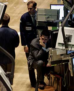 3月28日,受美國(guó)聯(lián)邦儲(chǔ)備委員會(huì)主席伯南克講話及油價(jià)上漲等因素影響,當(dāng)天紐約股市全面下挫,道瓊斯30種工業(yè)股票平均價(jià)格指數(shù)下跌近100點(diǎn)。新華社/路透 |