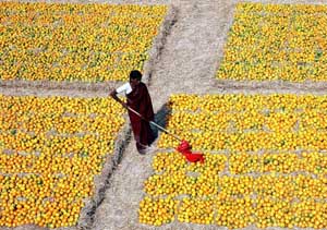在印度海得拉巴的一處水果批發(fā)市場(chǎng)里,一位賣(mài)主在清理桔子。印度位于南亞地區(qū),盛產(chǎn)熱帶以及亞熱帶水果。經(jīng)濟(jì)參考報(bào)資料照片 |