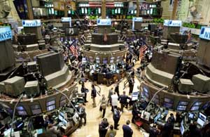 23日,美國紐約證券交易所股票交易大廳一片繁忙。當日,道瓊斯指數(shù)盤中創(chuàng)下12983.92點的歷史新高后,收盤下跌42.58點,收于12919.40點,跌幅為0.33%。新華社記者