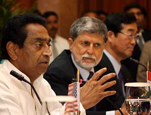 4月12日,在印度首都新德里,印度商業(yè)和工業(yè)部長卡邁勒·納特(左)、巴西外交部長塞爾索·阿莫林(中)和日本農(nóng)林水產(chǎn)大臣松岡利勝(右)出席新聞發(fā)布會。當(dāng)日,世界貿(mào)易組織6個關(guān)鍵成員巴西、歐盟、印度、美國、澳大利亞和日本在新德里宣布,他們同意將完成多哈回合談判的期限設(shè)在今年年底。經(jīng)濟參考報資料照片 | 多邊談判受阻后的必然選擇