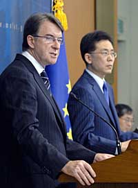 6日,歐盟貿(mào)易委員曼德爾森(左)和韓國外交通商部通商交涉本部長金鉉宗在韓國首都首爾出席新聞發(fā)布會。韓國與歐盟當(dāng)日宣布正式就簽署自由貿(mào)易協(xié)定問題進(jìn)行談判,雙方預(yù)計今年將舉行5至6輪會談,以盡早達(dá)成協(xié)議。新華社/路透 | 本報東京電