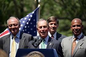 作為東道主,布隆伯格還向來(lái)賓介紹了紐約市的“綠色紐約”計(jì)劃。日前,布隆伯格提出了涉及10個(gè)領(lǐng)域的127項(xiàng)環(huán)保提案,其中包括對(duì)節(jié)能項(xiàng)目進(jìn)行支持、提高建筑物的環(huán)保標(biāo)準(zhǔn)、大力發(fā)展公共交通等,以期達(dá)到2030年全市減排30%溫室氣體的目標(biāo)。其中,爭(zhēng)議較大的是對(duì)進(jìn)入曼哈頓繁華地段車輛征收交通擁堵費(fèi)的提案。如這一提案獲紐約州議會(huì)通過(guò),紐約市將成為繼倫敦、新加坡、斯德哥爾摩之后采取此項(xiàng)措施的第四個(gè)大城市。