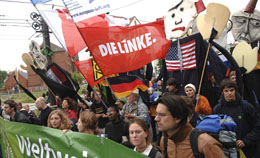 2日,抗議者參加在德國東北部城市羅斯托克舉行的反對八國集團(簡稱G8)首腦會議的游行集會。當日,共有來自世界各地的10萬多人參加了在羅斯托克舉行的反對八國集團首腦會議的游行集會。