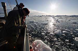 | 游客在格陵蘭島沿岸水域參觀。據(jù)測算,格陵蘭島的冰蓋約為260萬立方千米,目前正在以每年100至150立方千米的速度消融。聯(lián)合國環(huán)境規(guī)劃署在6月4日公布的《全球冰雪展望》報(bào)告中,詳細(xì)列舉了冰川、積雪加速融化的嚴(yán)重后果,并呼吁各國聯(lián)手采取切實(shí)行動,應(yīng)對全球變暖問題。新華社/路透 | 本報(bào)紐約電