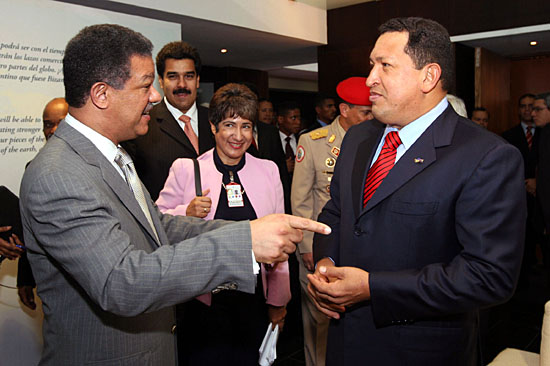11日,委內(nèi)瑞拉總統(tǒng)查韋斯(前右)在委內(nèi)瑞拉首都加拉加斯與參加“加勒比石油計(jì)劃”締約國第三屆首腦會議的多米尼加總統(tǒng)萊昂內(nèi)爾·費(fèi)爾南德斯(前左)交談。 “加勒比石油計(jì)劃”締約國第三屆首腦會議當(dāng)晚在加拉加斯落下帷幕。與會國領(lǐng)導(dǎo)人承諾將繼續(xù)推動地區(qū)能源一體化,保障地區(qū)能源安全。 | |