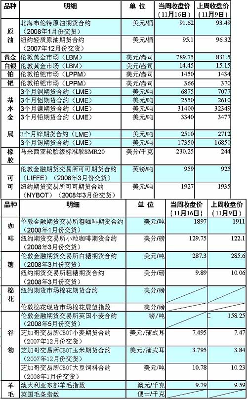 當(dāng)周美元對(duì)歐元匯率的穩(wěn)定使得多數(shù)金屬價(jià)格呈下跌態(tài)勢(shì)。繼前一周創(chuàng)下每盎司845.84美元的27年新高后,倫敦市場(chǎng)黃金期貨價(jià)格大幅回調(diào),當(dāng)周收于每盎司789.75美元。除錫價(jià)外,基本金屬價(jià)格全線走低,倫敦市場(chǎng)銅期貨收盤價(jià)已跌破每噸7000美元大關(guān)。巴克萊公司分析師稱,錫價(jià)之所以能逆市上行并創(chuàng)下每噸17575美元的歷史高位,主要因?yàn)槭袌?chǎng)對(duì)未來供給的擔(dān)心進(jìn)一步激發(fā)了買盤的興趣。 另一方面,當(dāng)周英鎊對(duì)美元匯率的大幅下跌推高了以英鎊計(jì)價(jià)的倫敦市場(chǎng)可可和白糖的期貨價(jià)格。因?yàn)閷?duì)于以美元進(jìn)行支付的國(guó)際購(gòu)買者來說,英鎊走軟相對(duì)降低了這些大宗商品的價(jià)格,進(jìn)而導(dǎo)致市場(chǎng)購(gòu)買興趣的提高。 繼本月7日觸及每桶98.62美元的歷史高位后,紐約原油期貨價(jià)格便開始掉頭向下,在過去一周內(nèi)徘徊于91美元至95美元之間。分析人士稱,美國(guó)原油商業(yè)庫(kù)存意外增加、國(guó)際機(jī)構(gòu)調(diào)低能源需求預(yù)測(cè)、歐佩克增產(chǎn)傳聞以及投機(jī)商陸續(xù)離場(chǎng)是國(guó)際油價(jià)當(dāng)周出現(xiàn)回調(diào)的原因。 美國(guó)能源部15日公布,在截至9日的一周里,美國(guó)原油商業(yè)庫(kù)存增加280萬桶,大大超出此前市場(chǎng)人士預(yù)計(jì)的30萬桶。當(dāng)天,歐佩克將其對(duì)四季度全球原油需求增長(zhǎng)率的預(yù)測(cè)從一個(gè)月前的2.1%下調(diào)至1.97%。此外,歐佩克秘書長(zhǎng)巴德里近日也表示,為了平抑油價(jià),歐佩克準(zhǔn)備隨時(shí)增產(chǎn)。 受累于原油和小麥?zhǔn)袌?chǎng)的疲勢(shì),芝加哥市場(chǎng)玉米期貨當(dāng)周震蕩走弱。相反,芝加哥市場(chǎng)大豆期貨一舉躍至19年高位。分析人士稱,當(dāng)周原油和黃金市場(chǎng)對(duì)大豆走勢(shì)的影響暫時(shí)退居次席,中國(guó)需求成為多頭市場(chǎng)炒作的依據(jù)。