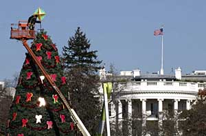 | 28日,在美國(guó)首都華盛頓白宮的南草坪,工人將一顆裝飾星放置在國(guó)家圣誕樹(shù)樹(shù)頂。國(guó)家圣誕樹(shù)的點(diǎn)燈儀式始于1923年,是美國(guó)圣誕節(jié)的傳統(tǒng)之一,2007年的點(diǎn)燈儀式將于12月6日舉行。新華社記者