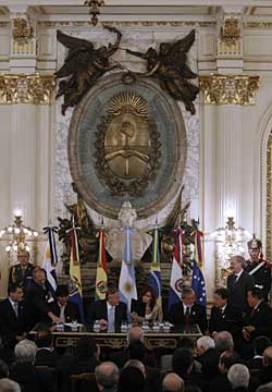 | 9日,厄瓜多爾總統(tǒng)科雷亞、玻利維亞總統(tǒng)莫拉萊斯、阿根廷總統(tǒng)基什內(nèi)爾和當(dāng)選總統(tǒng)克里斯蒂娜·費爾南德斯、巴西總統(tǒng)盧拉、巴拉圭總統(tǒng)杜阿爾特、委內(nèi)瑞拉總統(tǒng)查韋斯(從左至右)在阿根廷首都布宜諾斯艾利斯出席南方銀行成立的簽字儀式。新華社發(fā) | 本報布宜諾斯艾利斯電