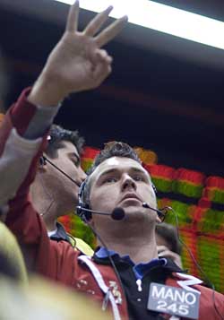 | 11日,美聯(lián)儲宣布降息后,交易員在芝加哥商品交易所忙碌。當(dāng)日,美國聯(lián)邦儲備委員會決定,將聯(lián)邦基金利率即商業(yè)銀行間隔夜拆借利率再降0.25個百分點至4.25%,以應(yīng)對信貸危機及可能產(chǎn)生的經(jīng)濟衰退后果。這是自9月份以來美聯(lián)儲第三次降息。新華社/路透 | 經(jīng)濟增速“正在放緩”
