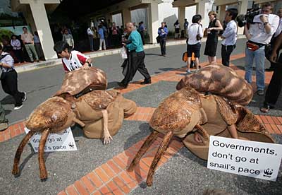 12月12日,在印度尼西亞巴厘島國(guó)際會(huì)議中心前,環(huán)保人士裝扮成蝸牛,旁邊的標(biāo)語(yǔ)牌上寫(xiě)著:“政府不要像蝸牛般爬行”。他們呼吁各國(guó)政府迅速采取行動(dòng),遏制全球氣候變暖。當(dāng)日,聯(lián)合國(guó)氣候變化大會(huì)高級(jí)別會(huì)議在巴厘島開(kāi)幕。 | |