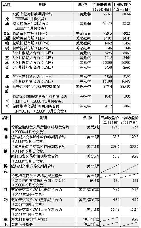 美國(guó)農(nóng)業(yè)部11日的報(bào)告稱(chēng),到本銷(xiāo)售年度結(jié)束時(shí)(明年5月31日),美國(guó)小麥庫(kù)存將僅為2.8億蒲式耳(762萬(wàn)噸),為60年來(lái)最低。同為小麥出口大國(guó)的阿根廷和澳大利亞由于受到干旱天氣的影響,小麥產(chǎn)量和出口量也明顯減少。另一方面,消費(fèi)國(guó)則不斷向國(guó)際市場(chǎng)尋求購(gòu)買(mǎi)小麥。 受美聯(lián)儲(chǔ)降息和美國(guó)原油庫(kù)存下降等因素影響,國(guó)際油價(jià)強(qiáng)勁反彈,之后由于美元走強(qiáng)以及投資者擔(dān)心原油需求將減少,紐約市場(chǎng)油價(jià)連續(xù)兩天走低,但仍收于每桶90美元上方。 美聯(lián)儲(chǔ)11日宣布,將聯(lián)邦基金利率下調(diào)0.25個(gè)百分點(diǎn)至4.25%,當(dāng)日國(guó)際油價(jià)重回每桶90美元上方。市場(chǎng)人士認(rèn)為,降息可以阻止美國(guó)經(jīng)濟(jì)陷入衰退并增加能源需求,同時(shí)可以使以美元計(jì)價(jià)的原油以及原油產(chǎn)品對(duì)持有其他貨幣的購(gòu)買(mǎi)者更具吸引力。 受美元升值因素影響,黃金和白銀期貨價(jià)格均小幅回落,其中倫敦市場(chǎng)黃金期貨價(jià)格當(dāng)周收于每盎司789.5美元。數(shù)據(jù)顯示,美元對(duì)其他幾種主要貨幣的匯率14日升至7周以來(lái)最高點(diǎn)。市場(chǎng)人士認(rèn)為,美元升值使以美元計(jì)價(jià)的大宗商品對(duì)其他貨幣的持有者顯得“更加昂貴”。 由于市場(chǎng)對(duì)美國(guó)經(jīng)濟(jì)放緩的擔(dān)憂仍未消除,基本金屬價(jià)格繼續(xù)走低,倫敦市場(chǎng)銅期貨價(jià)已跌至每噸6495美元。 遭遇暴雨襲擊后,橡膠主產(chǎn)地——馬來(lái)西亞和泰國(guó)南部地區(qū)洪水泛濫,橡膠價(jià)格因供給趨緊而攀升。受主要出口國(guó)科特迪瓦爆發(fā)的大罷工影響,可可價(jià)格也反彈至7月來(lái)最高點(diǎn)。
