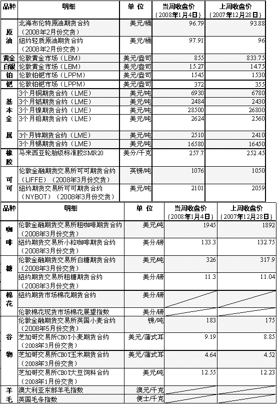 受非洲主要產(chǎn)油國尼日利亞國內(nèi)局勢持續(xù)動蕩、投資者擔(dān)心原油供應(yīng)緊張以及美元貶值等因素影響,國際油價在2008年的第一個交易日(2008年1月2日)即大幅上漲,當(dāng)日紐約市場2月份交貨的輕質(zhì)原油期貨價格不僅歷史上首度突破每桶100美元大關(guān),而且創(chuàng)下每桶99.62美元的歷史最高收盤紀錄。 截至2007年12月28日的一周里,美國原油商業(yè)庫存比前一周下降400萬桶,降幅大于分析人士預(yù)期的170萬桶。受此消息影響,紐約市場經(jīng)過反復(fù)震蕩后開始沖高,3日盤中一度達到每桶100.09美元的歷史最高價。但隨后受交易者獲利回吐影響,當(dāng)日收盤時該種原油期貨價格報收于每桶99.18美元,比前一個交易日下跌44美分。 美國勞工部1月4日公布的報告顯示,2007年12月份美國失業(yè)率上升到5%,高于前一個月的4.7%,為2005年11月份以來的最高水平。由于投資者擔(dān)心就業(yè)市場不景氣將影響美國消費增長,進而影響用油需求,4日國際油價繼續(xù)下滑。 歐佩克新任輪值主席、阿爾及利亞能源和礦業(yè)部長沙基卜·哈利勒1月5日表示,油價上升勢頭“很可能要持續(xù)到第一季度末”,預(yù)計到第二季度有望“穩(wěn)定”下來。 在美元疲軟、油價不斷突破紀錄的背景下,當(dāng)周其他大宗商品的期貨價格均有不同程度的上揚。1月3日,紐約商品交易所2月份交貨的黃金期貨合約價一度摸高至每盎司872.9美元,與28年前創(chuàng)下的每盎司873美元歷史最高紀錄僅“毫厘之差”。倫敦市場的黃金期貨價格1月3日升至每盎司868.89美元的歷史高位,鉑的期貨價格創(chuàng)下每盎司1554美元的歷史新高。 亞洲最近處于季風(fēng)季節(jié),潮濕的天氣影響了供給,橡膠價格因而走高。