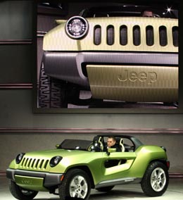 | 克萊斯勒公司展出的吉普Renegade概念車,它采用清潔柴油引擎,車身采用鋁制結(jié)構(gòu),并使用鋰電池組和電動(dòng)機(jī)作為輔助動(dòng)力,以獲得更好的燃油經(jīng)濟(jì)性。新華社記者