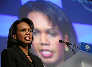 | 23日,美國國務(wù)卿賴斯在瑞士達(dá)沃斯舉行的世界經(jīng)濟(jì)論壇年會(huì)上講話。當(dāng)日,27位國家元首或政府首腦,110多位政府部長以及眾多知名企業(yè)領(lǐng)導(dǎo)人和政界人士聚首瑞士達(dá)沃斯,參加一年一度的世界經(jīng)濟(jì)論壇年會(huì)。新華社發(fā) | 本報(bào)綜合報(bào)道