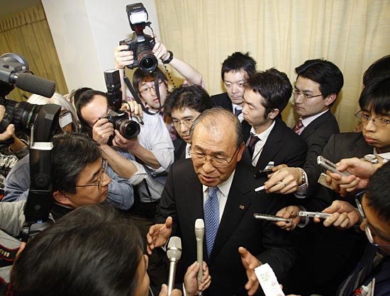 2月19日,東芝公司總裁兼首席執(zhí)行官西田厚聰在日本東京舉行的新聞發(fā)布會上被記者包圍。當(dāng)天,東芝正式宣布全面退出高清DVD(HD DVD)業(yè)務(wù),而新一代DVD制式之爭將以索尼的藍光(BLUE RAY)技術(shù)陣營獲勝告終。新華社/路透