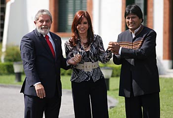 | 23日,阿根廷總統(tǒng)克里斯蒂娜(中)同到訪的巴西總統(tǒng)盧拉(左)和玻利維亞總統(tǒng)莫拉萊斯在布宜諾斯艾利斯舉行會(huì)晤。三國(guó)總統(tǒng)決定成立一個(gè)部長(zhǎng)級(jí)工作小組,協(xié)調(diào)這三個(gè)南美洲國(guó)家的能源政策。新華社發(fā)(馬丁·薩巴拉