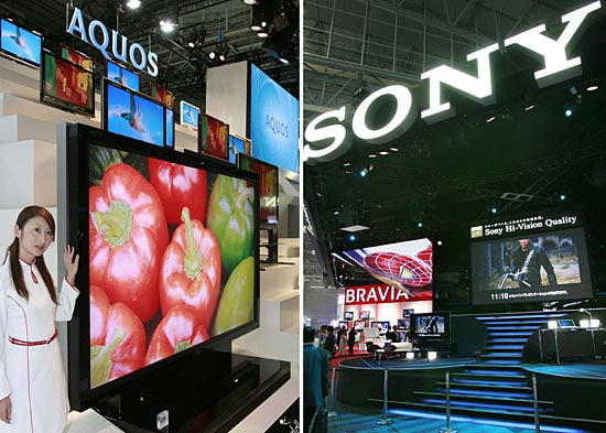 這張拼版照片顯示的是2007年10月2日,夏普公司(左)和索尼公司(右)在日本千葉舉行的一個電子產(chǎn)品交易展上展出各自的液晶顯示器產(chǎn)品。 26日,日本索尼和夏普公司宣布,兩家企業(yè)將成立合資公司,共同生產(chǎn)液晶顯示器(LCD)。兩家公司在當天發(fā)表的聯(lián)合聲明中說,合資公司由夏普和索尼分別持股66%和34%。合資公司將為40英寸、50英寸和60英寸的平板電視生產(chǎn)液晶顯示屏。 | |