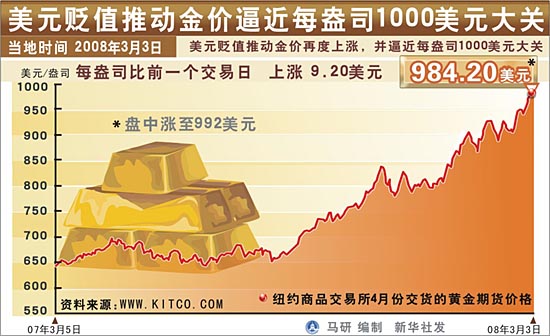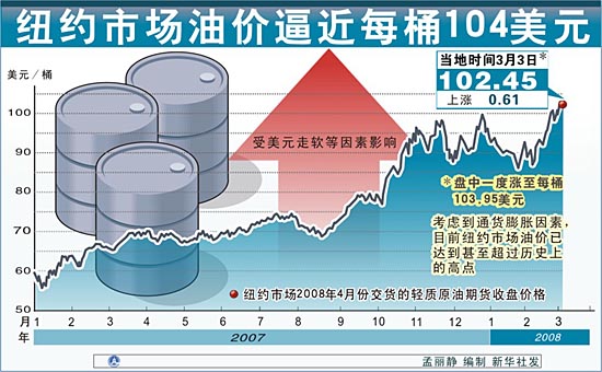 在美元匯率走軟的影響下,3日油價(jià)和貴金屬價(jià)格紛紛上揚(yáng)。 油價(jià)方面,雖然國(guó)際油價(jià)的絕對(duì)數(shù)字近日屢創(chuàng)新高,但許多市場(chǎng)分析師認(rèn)為并沒(méi)達(dá)到上世紀(jì)80年代初期的峰值水平。如果把歷年累計(jì)的通貨膨脹因素考慮在內(nèi),在1980年創(chuàng)下的每桶38美元的歷史高價(jià)相當(dāng)于如今的103.76美元。但紐約商品交易所4月份交貨的輕質(zhì)原油期價(jià)3日摸至每桶103.95美元,觸及盤(pán)中交易價(jià)格新高,同時(shí)成為將通脹因素考慮在內(nèi)的歷史最高紀(jì)錄,被認(rèn)為是在真正意義上“創(chuàng)了新高”。 當(dāng)日收盤(pán)時(shí),紐約商品交易所4月份交貨的輕質(zhì)原油期貨價(jià)格較前一交易日上漲61美分,收于每桶102.45美元。倫敦國(guó)際石油交易所4月份交貨的北海布倫特原油期貨價(jià)格每桶上漲38美分,收于100.48美元。 3日,紐約商品交易所4月份交貨的黃金期貨價(jià)格盤(pán)中一度創(chuàng)下每盎司992美元的歷史新高。3月份交貨的白銀期貨價(jià)格每盎司收于20.073美元,為1980年以來(lái)最高點(diǎn)。4月份交貨的白金期貨價(jià)格盤(pán)中創(chuàng)下每盎司2245美元的歷史新高。 美國(guó)芝加哥阿拉龍交易公司分析師菲爾·弗林在接受媒體采訪時(shí)指出,美元大幅貶值正推動(dòng)包括原油期貨在內(nèi)的各種大宗商品價(jià)格持續(xù)走高。 有分析指出,目前國(guó)際市場(chǎng)上的原油和貴金屬期貨品種主要以美元計(jì)價(jià),在美元貶值的長(zhǎng)期預(yù)期下,市場(chǎng)上會(huì)形成兩大動(dòng)能:一是持有其他強(qiáng)勢(shì)貨幣的投資者將積極買(mǎi)入這些期貨合約,二是部分持有美元資產(chǎn)的投資者會(huì)迅速轉(zhuǎn)而買(mǎi)入大宗商品期貨合約,以避免美元貶值帶來(lái)的損失。
