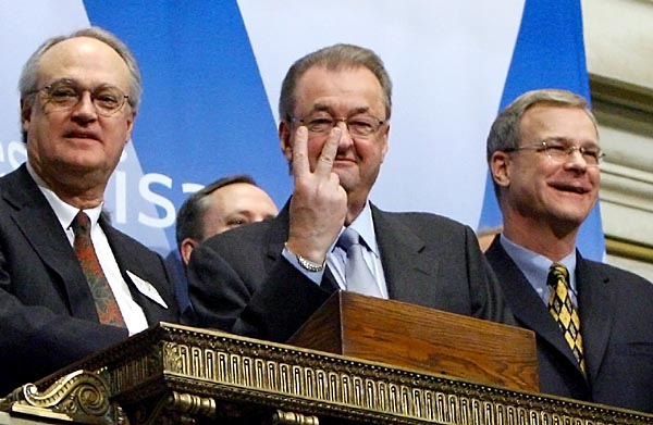 19日,維薩公司(Visa)總裁兼首席執(zhí)行官約瑟夫·W·桑德斯(中)在紐約證券交易所敲響開市鐘時打出表示公司名和成功的“V”字手勢。當天,全球最大信用卡組織維薩公司股票在紐約證交所正式交易。行業(yè)人士預計,其開盤市值將達到360億美元。維薩公司18日通過首次公開發(fā)行股票(IPO)成功融資179億美元,創(chuàng)美國歷史上IPO融資規(guī)模之最。這對于近期出現(xiàn)動蕩的美國金融行業(yè)是個重要利好消息。
