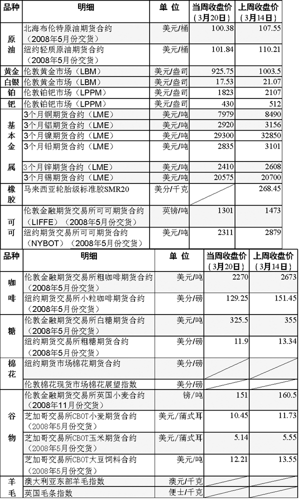 當(dāng)周大宗商品市場(chǎng)呈現(xiàn)戲劇性變化。周一(17日)、周二(18日)延續(xù)前幾周行情走勢(shì),油價(jià)、金價(jià)均創(chuàng)歷史新高;但周三(19日)、周四(20日)各市場(chǎng)行情紛紛出現(xiàn)大逆轉(zhuǎn),其逆轉(zhuǎn)態(tài)勢(shì)同樣創(chuàng)出了多年來的單日或單周最大跌幅。周五(21日)為復(fù)活節(jié)假期,美國(guó)及歐洲金融市場(chǎng)均休市一天。 在原油市場(chǎng),紐約原油期貨17日盤中創(chuàng)出每桶111.80美元的歷史新高。此后,受美國(guó)上周原油庫(kù)存增加以及美聯(lián)儲(chǔ)降息幅度不及部分市場(chǎng)人士預(yù)期等因素影響,19日原油期貨價(jià)格每桶急跌近5美元,創(chuàng)下17年來的最大單日跌幅;20日更是一度跌至100美元以下,收盤時(shí)回漲至每桶101.84美元。 在黃金市場(chǎng),繼前一周突破每盎司1000美元大關(guān)后,17日紐約市場(chǎng)黃金價(jià)格再次創(chuàng)下每盎司1033.9美元的歷史最高紀(jì)錄(當(dāng)日收盤于1002.60美元)。不過,19日金價(jià)卻比前一個(gè)交易日每盎司直線下跌60.80美元,收于943.50美元,單日跌幅達(dá)6.1%。20日繼續(xù)下跌,收于每盎司920美元,一周內(nèi)金價(jià)共下跌8%,為1990年8月份以來的單周最大跌幅。分析師杰姆斯·摩爾指出,金價(jià)走低主要是受到美元匯率回升的影響。由于美聯(lián)儲(chǔ)降息幅度不及投資者預(yù)期,美元匯率受到一定支撐,這削弱了黃金作為避險(xiǎn)保值工具的吸引力,造成金價(jià)大幅下跌。 白銀、銅等金屬價(jià)格當(dāng)周走勢(shì)與黃金類似。其中,白銀、銅的價(jià)格一周跌幅分別達(dá)到18%和6.6%。類似的回調(diào)行情同樣發(fā)生在小麥、大豆等谷物期貨市場(chǎng)上。 分析人士稱,商品期貨價(jià)格的大幅跳水反映出市場(chǎng)對(duì)美國(guó)經(jīng)濟(jì)衰退的擔(dān)憂在日益加劇。最近幾周來,次貸危機(jī)對(duì)美國(guó)實(shí)體經(jīng)濟(jì)的真正影響開始顯現(xiàn),并逐步體現(xiàn)為市場(chǎng)對(duì)原材料的需求減少。而美國(guó)經(jīng)濟(jì)對(duì)能源、金屬、農(nóng)產(chǎn)品等原材料需求的下跌,必然在長(zhǎng)期內(nèi)導(dǎo)致這些商品價(jià)格的下跌。