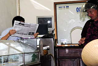 | 13日,在越南首都河內(nèi)市河中街一家外匯代理店,工作人員正在讀報(bào)。越南國家銀行近日出臺新規(guī)定加強(qiáng)了對外匯市場的監(jiān)控,使自由市場大部分外匯代理店生意日漸蕭條。本報(bào)記者