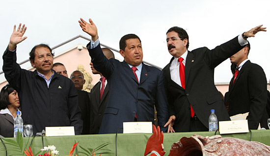 25日,在洪都拉斯首都特古西加爾巴自由廣場(chǎng),洪都拉斯總統(tǒng)塞拉亞(右)、委內(nèi)瑞拉總統(tǒng)查韋斯(中)和尼加拉瓜總統(tǒng)奧爾特向人群揮手致意。洪都拉斯總統(tǒng)塞拉亞當(dāng)日簽署決議書,宣布洪都拉斯正式加入“美洲玻利瓦爾替代計(jì)劃”。