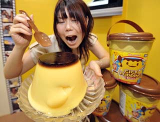 3日,在日本東京國際禮品展上,日本Tomy玩具公司員工展示一個(gè)布丁造型的玩具。這款玩具將于10月份在日本上市。近年來,以各種食品為造型的仿真玩具在日本暢銷。