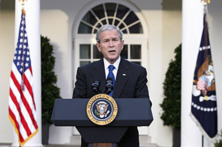 | 14日,美國總統(tǒng)布什在華盛頓白宮發(fā)表講話。布什當天宣布,作為7000億美元救市計劃的具體舉措,政府將動用其中的2500億美元直接購買金融機構(gòu)股份,以此促進金融市場恢復運轉(zhuǎn)。新華社/路透 | 本報紐約電