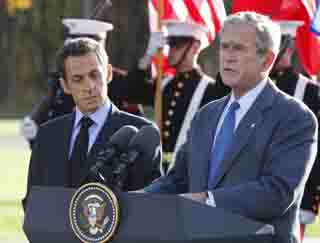 18日,美國(guó)總統(tǒng)布什(右)在馬里蘭州戴維營(yíng)發(fā)表講話(huà)。當(dāng)天,布什在會(huì)見(jiàn)到訪的法國(guó)總統(tǒng)薩科齊和歐盟委員會(huì)主席巴羅佐時(shí)宣布,美國(guó)將于近期就國(guó)際金融危機(jī)問(wèn)題主持召開(kāi)一次國(guó)際峰會(huì)。新華社/法新