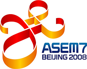 | 圖為第七屆亞歐首腦會議會標,該造型創(chuàng)意來源于中國結(jié),寓含了亞歐合作與和諧的精神。會標圖案中字符a和e分別是亞洲和歐洲的英文單詞首字母,字符e的金色部分構(gòu)成漢字“七”,表示會議屆次。會標文字部分中ASEM為亞歐會議英文縮寫,數(shù)字“7”亦代表會議屆次,BEIJING