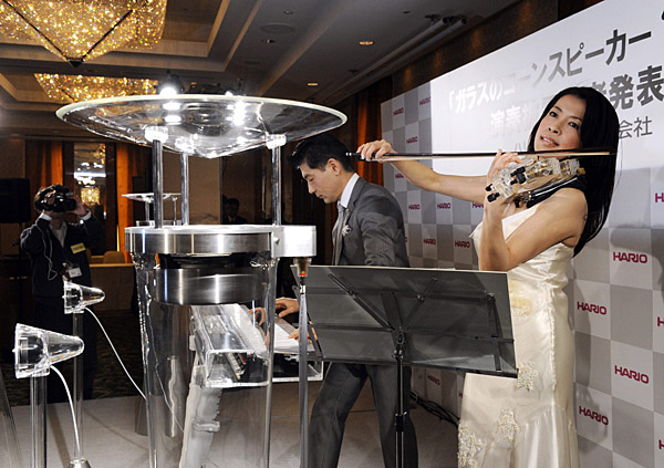 27日,在日本東京舉辦的玻璃制音響系統(tǒng)展示會上,小提琴手和鍵盤手演奏用玻璃制作的樂器。當日,名為“Hario”的玻璃制音響系統(tǒng)在東京展示。這套包括一個低音、兩個中音和兩個高音揚聲器的音響系統(tǒng)是用超薄防熱玻璃制作而成的,售價超過10萬美元。新華社/法新