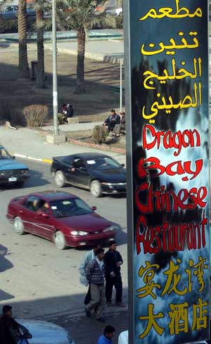 該圖為2003年12月31日開業(yè)的宴龍灣大酒店的標牌。建立在巴格達市中心的該酒店是伊拉克戰(zhàn)后首家中國人投資的中餐飯店。新華社記者:黃敬文