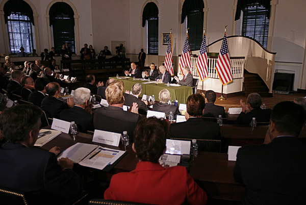| 2日,美國當(dāng)選總統(tǒng)貝拉克·奧巴馬(后右三)在賓夕法尼亞州費城出席美國全國州長協(xié)會年會。經(jīng)濟衰退背景下,美國許多州長在為財政赤字犯愁。奧巴馬當(dāng)日在這里會見本國40多名州長時向他們保證,將快速落實含減稅、加大基礎(chǔ)設(shè)施建設(shè)投入等措施的經(jīng)濟復(fù)蘇方案,且在方案設(shè)計過程中征詢州長建議。新華社/路透 | |