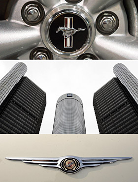 | 圖為拼版照片,顯示了2006年10月14日在美國(guó)邁阿密拍攝的2007年款福特野馬汽車的標(biāo)志(上),2006年7月12日拍攝的位于美國(guó)底特律的通用汽車總部(中)和2007年5月14日在美國(guó)邁阿密拍攝的克萊斯勒汽車的標(biāo)志。新華社/法新 | 經(jīng)過(guò)馬拉松式的艱苦談判,美國(guó)國(guó)會(huì)民主黨議員與白宮官員9日晚就總額150億美元的汽車業(yè)救援方案達(dá)成原則一致,美國(guó)汽車業(yè)因而將成為近來(lái)繼金融業(yè)之后第二個(gè)得到政府救助的行業(yè)。 該協(xié)議最快可望在10日送交國(guó)會(huì)表決。但據(jù)參與談判的官員透露,由于一些共和黨議員仍對(duì)一些具體條款持有異議,該原則能否在國(guó)會(huì)通過(guò)還存在變數(shù)。