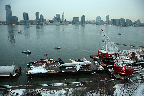 18日,在美國(guó)紐約,被打撈出哈得孫河的全美航空公司1549號(hào)航班客機(jī)在岸邊等待運(yùn)輸,它將被運(yùn)往新澤西州進(jìn)行進(jìn)一步的檢查。該客機(jī)15日下午因飛鳥撞擊導(dǎo)致引擎故障,墜入紐約哈得孫河。因機(jī)長(zhǎng)沉著應(yīng)對(duì)和紐約應(yīng)急救援部門的快速反應(yīng),150名乘客以及5名機(jī)組人員全部獲救。新華社/路透