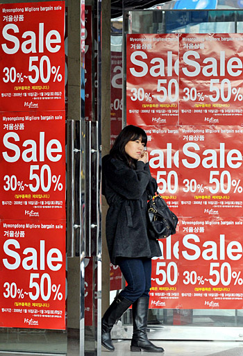 1月22日,在韓國首都首爾,一名行人經(jīng)過貼滿打折廣告的商場(chǎng)大門。韓國中央銀行韓國銀行22日發(fā)布報(bào)告說,由于國際需求持續(xù)下降導(dǎo)致制造業(yè)和出口惡化,去年第四季度韓國國內(nèi)生產(chǎn)總值(GDP)比前一季度大幅縮水5.6%。新華社/法新