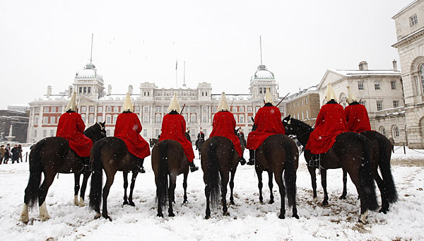 | 2日,在英國(guó)倫敦,英國(guó)皇家騎兵團(tuán)成員在風(fēng)雪中佇立。行業(yè)協(xié)會(huì)3日公布的一份調(diào)查數(shù)據(jù)顯示,1日晚起出現(xiàn)的連續(xù)降雪給英國(guó)造成的經(jīng)濟(jì)損失可能超過(guò)10億美元。如果降雪持續(xù),這一數(shù)字可能繼續(xù)上升,使本已陷入衰退的英國(guó)經(jīng)濟(jì)雪上加霜。新華社/路透 | |