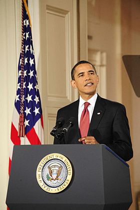 | 9日,美國總統(tǒng)奧巴馬在白宮舉行就職以來的首場新聞發(fā)布會。新華社記者 張巖