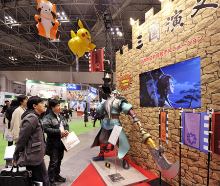 18日,在日本首都東京舉行的國際動漫展上,人們觀看由中國和日本聯(lián)合制作的52集高清動畫片《三國演義》。本屆國際動漫展將持續(xù)4天,來自日本和其它國家和地區(qū)的大約250家公司在這里展示他們最新的動漫作品,預(yù)計前來參加的觀眾將達到13000人。