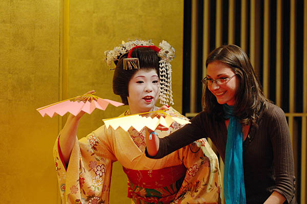 21日,一名外國游客在東京與藝妓進(jìn)行一項(xiàng)傳統(tǒng)日本游戲。日本政府日前提出要在2020年前后將赴日外國游客增至2千萬的目標(biāo),其中傳統(tǒng)藝術(shù)和獨(dú)特的飲食文化將是宣傳重點(diǎn)。