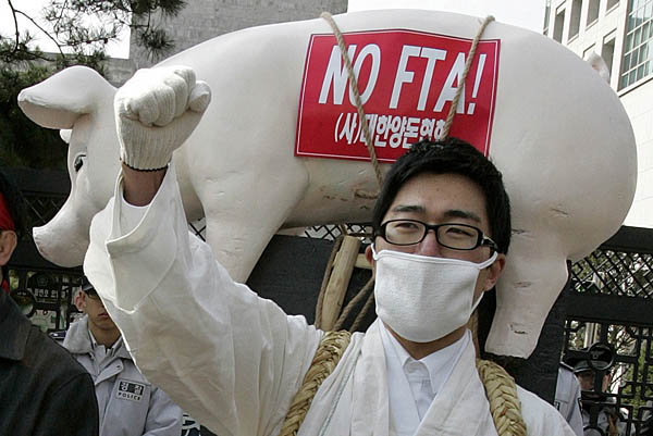 韓農(nóng)民抗議韓國(guó)與歐盟自由貿(mào)易協(xié)定談判