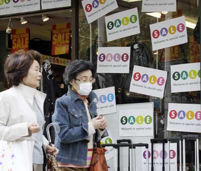 1日,在日本首都東京一商業(yè)區(qū),兩名婦女從貼著“打折”標(biāo)語(yǔ)的櫥窗前走過(guò)。