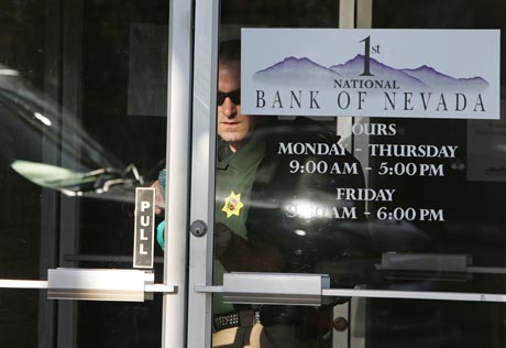 2008年7月25日,美國(guó)內(nèi)華達(dá)州第一國(guó)民銀行破產(chǎn)停業(yè),一名調(diào)查人員鎖上大門(mén)。新華社/美聯(lián) |