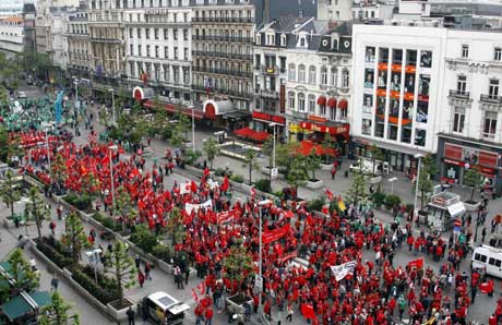 數(shù)千名歐洲工人在比利時首都布魯塞爾參加名為“對抗金融危機:以人為本”的抗議游行。歐洲工會聯(lián)合會從14日開始分別在馬德里、布魯塞爾、布拉格和柏林組織當(dāng)?shù)毓と诉M行抗議游行,要求政府在對抗當(dāng)前金融危機的同時采取措施保護就業(yè)市場。新華社/路透