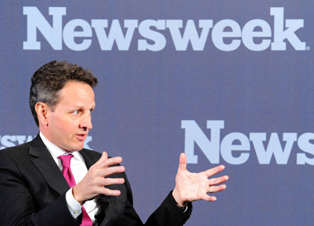 18日,在美國華盛頓,美國財政部長蓋特納在《新聞周刊》雜志舉辦的午餐會上發(fā)表講話。蓋特納當(dāng)天表示,美國經(jīng)濟(jì)正趨于穩(wěn)定,但失業(yè)率仍將繼續(xù)上升。新華社/法新 |