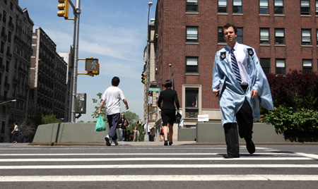 5月20日,一名美國(guó)紐約哥倫比亞大學(xué)的學(xué)生趕來(lái)參加畢業(yè)典禮。由于經(jīng)濟(jì)不景氣,目前美國(guó)就業(yè)市場(chǎng)正處于過(guò)去數(shù)年來(lái)最糟糕的階段,大學(xué)畢業(yè)生的就業(yè)也受到波及。據(jù)全美大學(xué)和雇主協(xié)會(huì)最近發(fā)布的調(diào)查報(bào)告顯示,美國(guó)就業(yè)市場(chǎng)等待2009年大學(xué)畢業(yè)生的就業(yè)機(jī)會(huì)比去年同期下降大約10個(gè)百分點(diǎn)。就業(yè)難集中體現(xiàn)在受到經(jīng)濟(jì)不振沖擊最大的一些行業(yè)。