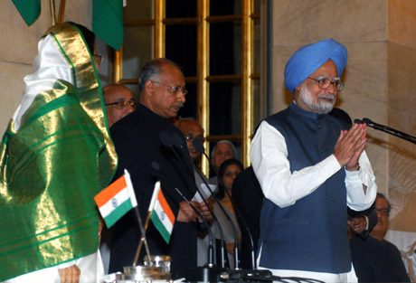 22日,在印度首都新德里,連任的印度總理曼莫漢·辛格(右一)宣誓就職。當(dāng)日,以曼莫漢·辛格總理為首的新一屆印度政府在印度總統(tǒng)府正式宣誓就職。新華社發(fā) | 以總理辛格為首的印度新政府22日宣誓就職后,其內(nèi)外政策走向成為印度國內(nèi)外輿論關(guān)注的焦點(diǎn)。當(dāng)?shù)孛襟w普遍認(rèn)為,繼續(xù)拉動(dòng)本國經(jīng)濟(jì)發(fā)展將是印度新政府各項(xiàng)工作的重中之重。 在印度新一屆政府中,前外交部長慕克吉出任財(cái)政部長,印度“硅谷”班加羅爾建造者之一、來自南方的前卡納塔克邦首席部長克里希納出任外交部長。慕克吉23日對(duì)媒體表示,保護(hù)印度經(jīng)濟(jì)免受國際經(jīng)濟(jì)衰退帶來的沖擊是新一屆政府的首要任務(wù),同時(shí)新政府將采取措施激活本國經(jīng)濟(jì),保持經(jīng)濟(jì)增長?死锵<{在會(huì)見記者時(shí)表示,印度外交是為經(jīng)濟(jì)發(fā)展服務(wù)的,印度政府的目標(biāo)是在今后相當(dāng)長的時(shí)間內(nèi)保持經(jīng)濟(jì)增長,做到這一點(diǎn)需要和平安寧的周邊環(huán)境和有利的國際環(huán)境。